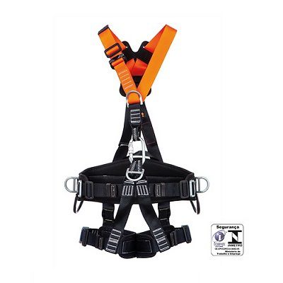 Possui cinco pontos de conexão sendo uma meia argola peitoral em aço, uma meia argola umbilical em aço, uma meia argola dorsal em aço e duas meias argolas laterais de aço como pontos de conexão para posicionamento na cintura.