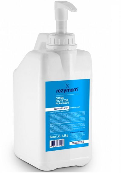 O Creme Protetor Rezymom Especial 3 em 1 Regenerador forma uma camada de proteção invisível na pele. Contém função regeneradora, que pode auxiliar na recuperação da pele. A sua fórmula foi desenvolvida especialmente para uma secagem mais rápida do que os demais cremes existentes no mercado. Possui ainda uma grande vantagem: pode ser usado em todo o corpo, inclusive no rosto. Protege contra produtos agressivos à pele como óleo diesel, thiner, querosene, gasolina, água-raz, óleo de corte, metiletilcetona, tolueno, percloroetileno, adesivo à base de água, solvente, cal e cimento. Com o objetivo de não deixar resíduos em peças, ele é isento de silicone. Também é visível à luz negra, possibilitando assim a comprovação de sua aplicação – que é obrigatória por lei nas empresas por se tratar de um EPI (equipamento de proteção individual).
