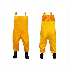 Jardineira de segurança confeccionada em KP400 (fios de poliéster revestidos de PVC em ambas as faces), fivelas plásticas para fechamento, alças do mesmo tecido para ajuste e botas de PVC soldadas na jardineira. Acoplada com botas de CA nº 33.139. Atua na proteção do tronco e membros inferiores do usuário contra riscos de origem química, não deve ser utilizado para uso contra agrotóxicos.
