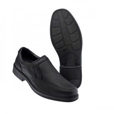 Sapato com fechamento em elástico lateral recoberto, confeccionado 100% em couro hidrofugado com acabamento de alta performance, palmilha interna em EVA Termoconformada, solado de poliuretano (PU) injetado diretamente no cabedal.